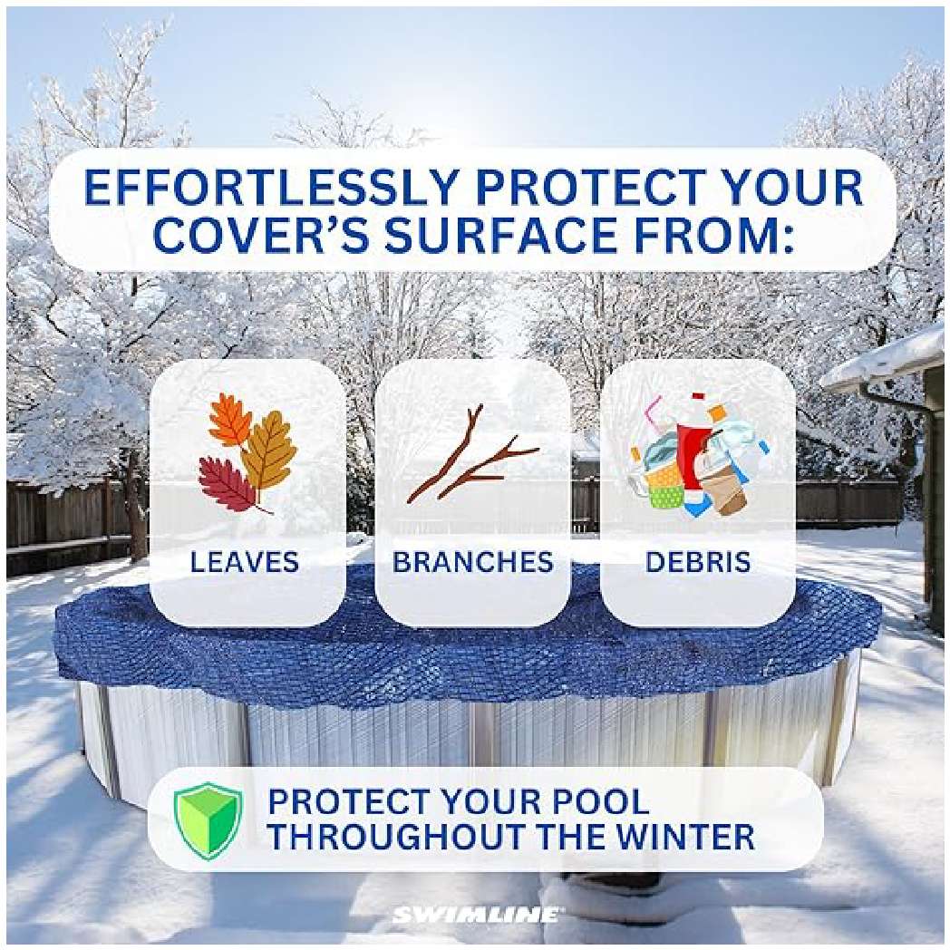 The Swimline Leaf Net Winter Cover Kit provides an efficient way to keep leaves and debris out of your above-ground pool, featuring a 16 x 32 ft. oval shape with a 3-foot overlap. This black leaf net cover is designed to catch leaves before they sink to the bottom, simplifying pool maintenance during fall and winter. Made from lightweight but durable materials, it is easy to install and remove, providing a hassle-free way to protect your pool. The cover kit includes everything needed for a secure fit, ensuring that it stays in place even in windy conditions. Ideal for above-ground pools, this cover kit helps you enjoy a cleaner pool with less effort.