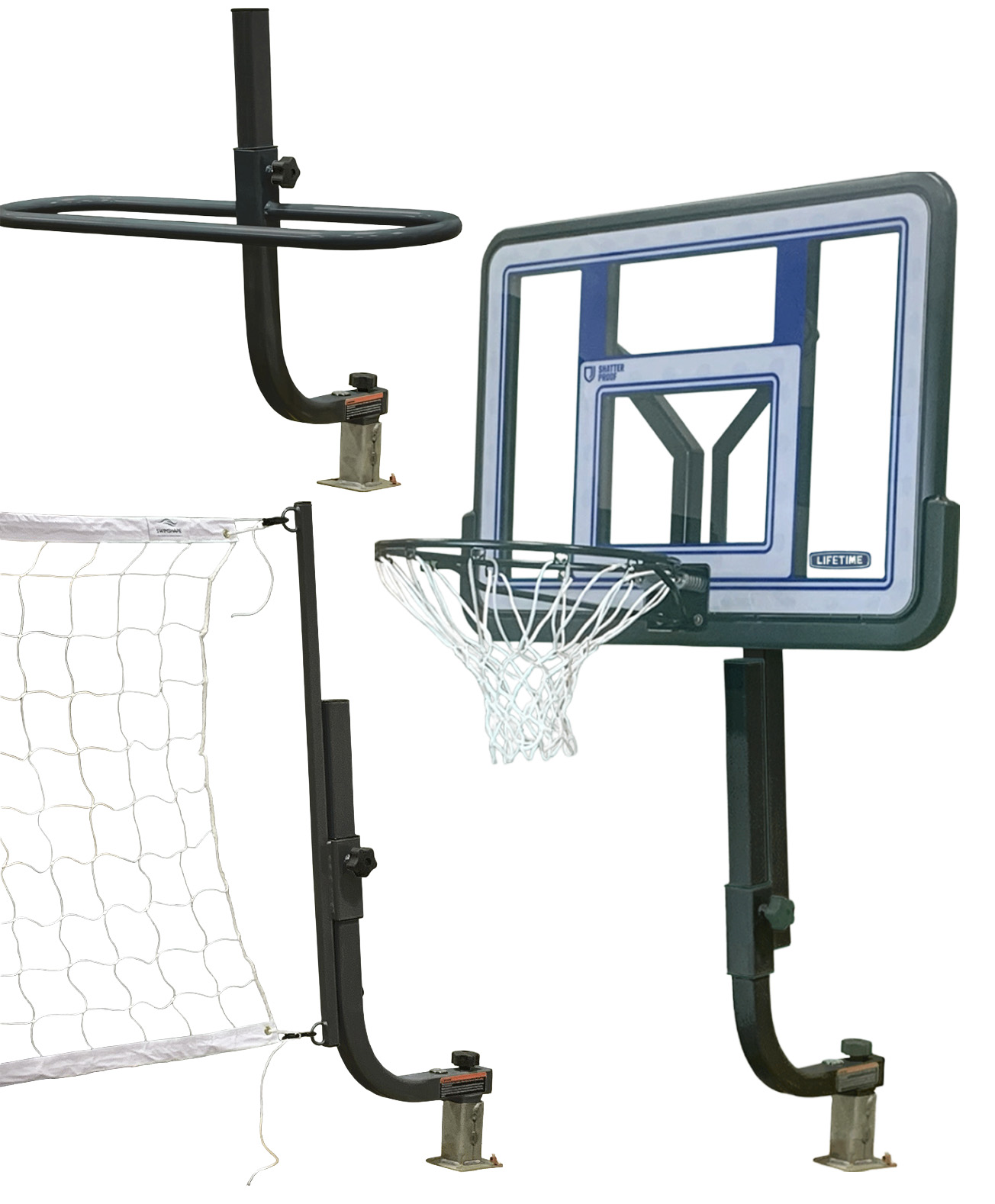 The SwimShape TriplePlay All-In-One Combo turns any backyard pool into a multi-sport and fitness hub, combining a premium basketball hoop, an adjustable volleyball set, and the Pool-Up strength bar in one modular system. Designed for fast changeovers, both poolside bases accept any of the included attachments, so you can go from a game of hoops to a volleyball match—or a low-impact, resistance-boosted workout—in minutes. Built for real-world pool environments, TriplePlay uses thermoplastic powder-coated steel and marine-grade stainless hardware to resist rust and corrosion in salt or chlorine water.