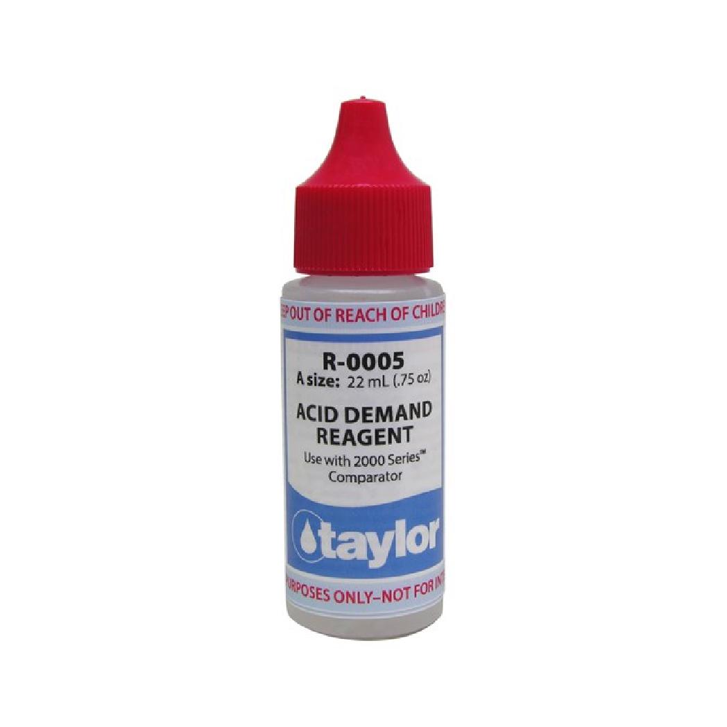 The Taylor Acid Demand Reagent #5 is an essential component for accurate water testing, specifically designed to measure the acid demand in pool and spa water. This 3/4 oz. bottle is convenient for smaller testing needs, making it ideal for residential pool owners who need to maintain balanced pH levels. The reagent is easy to use, ensuring precise measurements that help in adjusting the water chemistry effectively. Taylor’s high-quality formula provides reliable results, so you can feel confident in your water maintenance routine. Perfect for use with Taylor test kits, this reagent makes monitoring pool water simple and efficient.