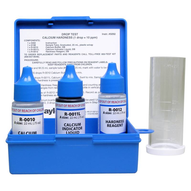 The Taylor Technologies model K-1770 drop test kit. Tests for calcium hardness. One drop equals 10 ppm. The method of chemistry used is EDTA Titration test method.