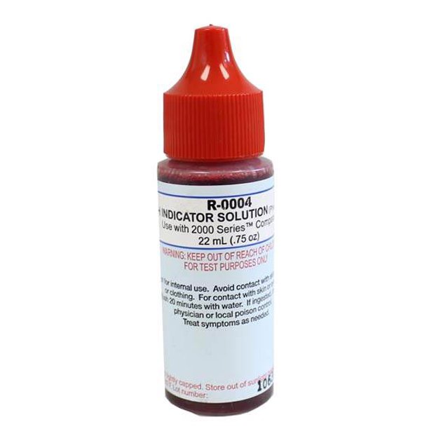 The Taylor Technologies R-0004-A pH Indicator Solution is a replacement reagent for the Taylor Test Kits. One bottle is .75 oz (22 mL) of pH Indicator #4. Chemical Composition: 90-99% Deionized Water, 0.1-5% Trade Secret, 0.1-5% Other Components Below Reportable Levels. For use with 2000 Series Liquid Swimming Pool Test Kits.