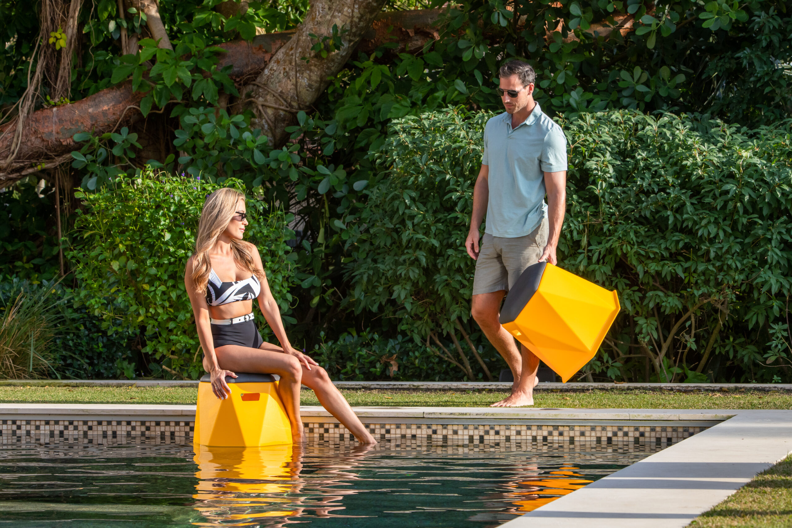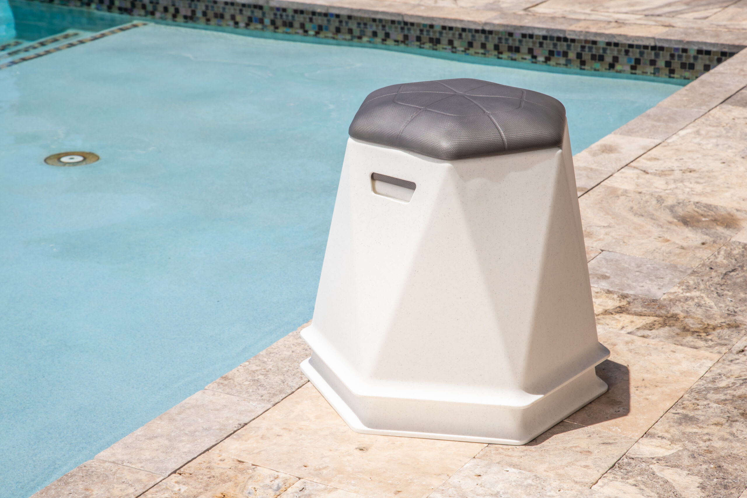 Twist and Shout…This stacking seat has a twist and it’s more than just the cool looks. This stool can be used in a swimming pool or as seating in a school. Use it here or use it there. Use it inside, outside, or anywhere. Twisted Hex Stools are stackable and all heights can be stacked together. Lightweight and easy to carry. Supports up to 350 lbs. The open bottom and dual hand holds allows you to place the stool anywhere on the tanning ledge in an instant, then easily remove it from the pool and use it on the patio for extra seating.