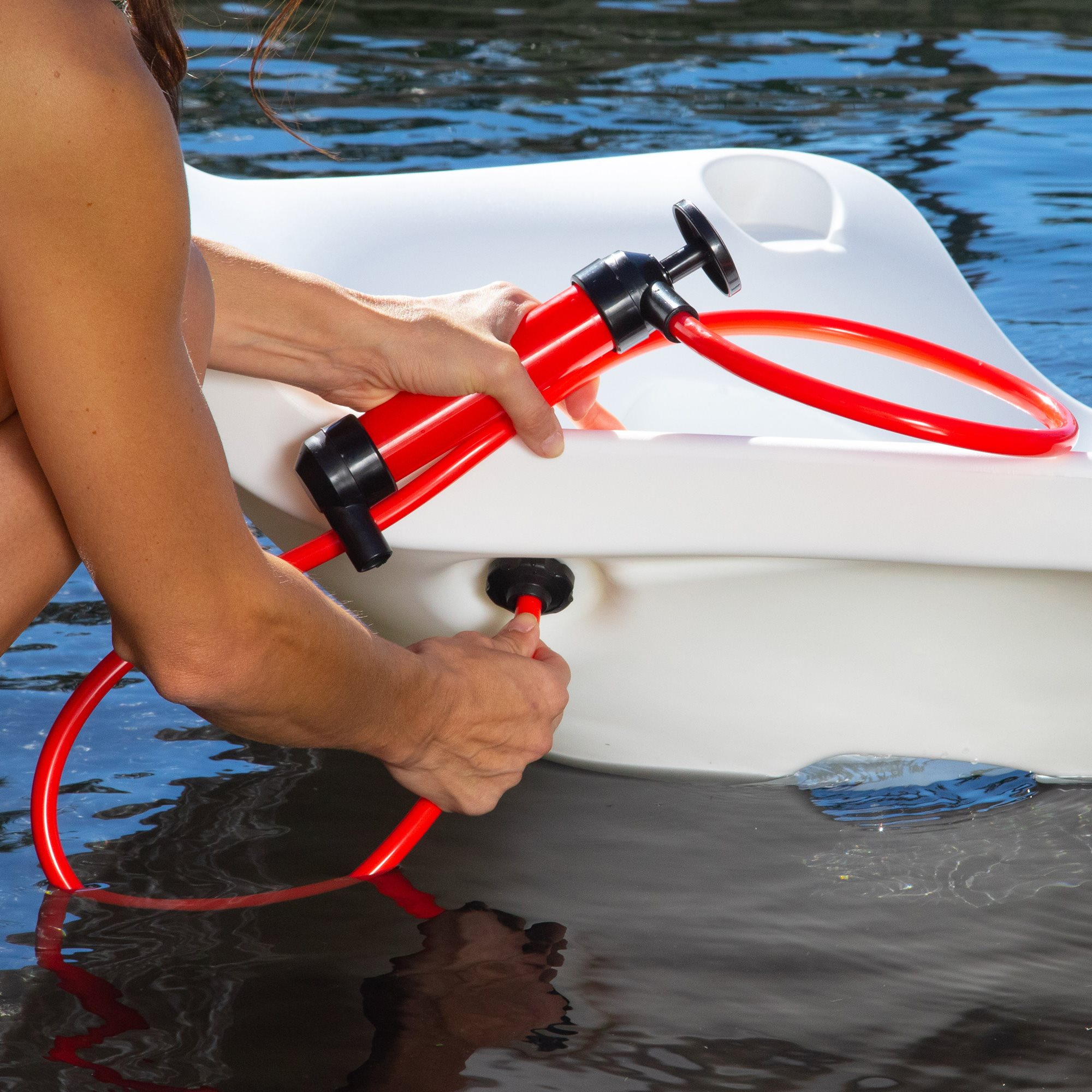 - Optional Vacuum Pump: Every Shayz includes a vacuum valve. The vacuum pump allows the user to set Shayz on the tanning ledge (see maximum pool depths above). Then attach the pump hose to the port on the vacuum valve and pump for 1 to 2 minutes until water begins to eject from the pump. This pump action draws air out of the Shayz core and water is drawn into the Shayz core through multiple openings on the bottom of the lounger. This action keeps water in the core due to the vacuum pressure and adds extra ballast weight to Shayz to make it more resistant to movement from wave and wind action.