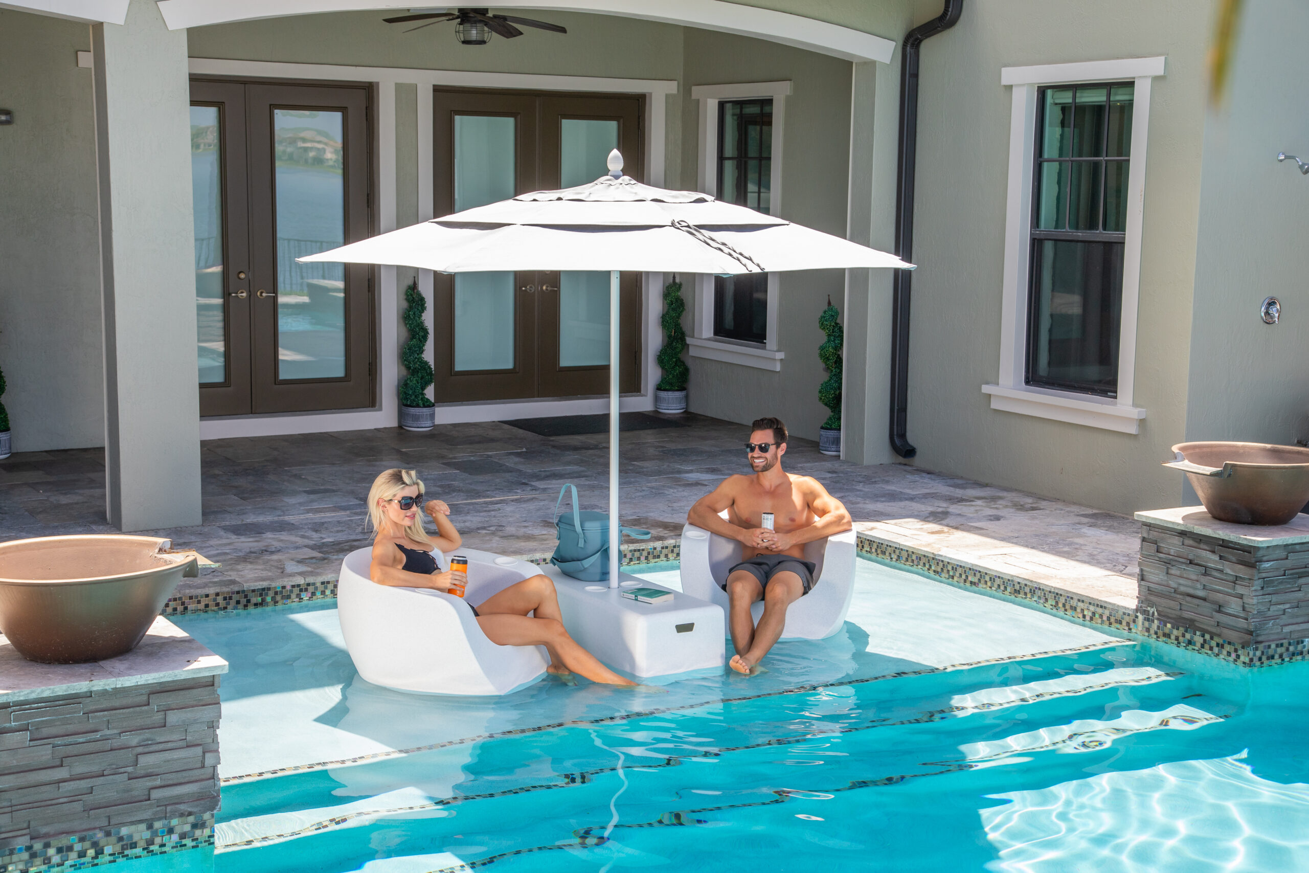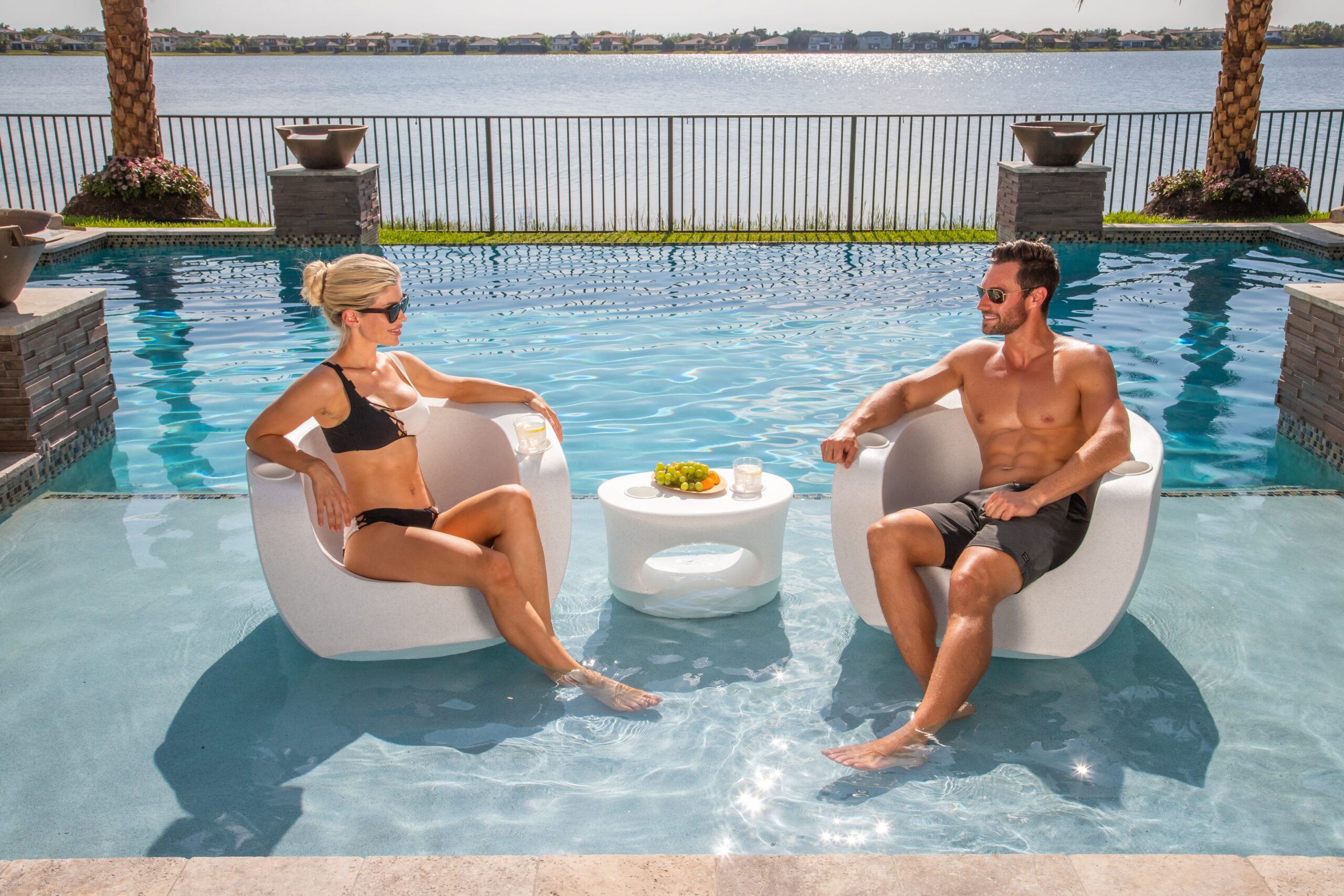 Tenjam SPLASH is a show-stopping new line of fashionable furniture for in and around the pool. Rust and waterproof, the Tenjam pool set is high-end, trendy, and sure to last through seasons of sun and water. Surface Heat Warning: Plastic chairs get hot in the sun. Just like plastic coolers, plastic stadium seats, and other plastic products. Darker colors generally feel hotter to the touch than lighter colors when exposed to direct sun. It maybe necessary to splash the products with pool water to bring the seating surface temperature down to a comfortable level prior to use.