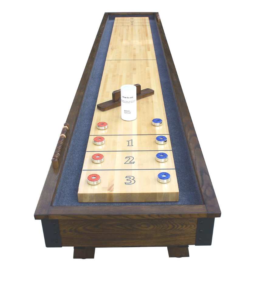 The Cheyenne Shuffleboard has the perfect mix of rustic-industrial design and quality craftsmanship. Crafted from furniture-grade solid hardwood and hardwood veneer, featuring Robust, angled post legs that deliver a rock-solid foundation for the 1.75-in thick butcher block playing surface. The rugged 1-in thick cabinet and post legs are beautifully finished in a multi-step furniture finish accented with aged metal hardware. More than just a stylish addition to your gaming space, it’s a beautiful piece of furniture that is functional and fun. Comes with all shuffleboard accessories: 4 Blue pucks, 4 Red pucks, 2 ABS abacus scoring units, 1 table brush and 1 can of table wax.