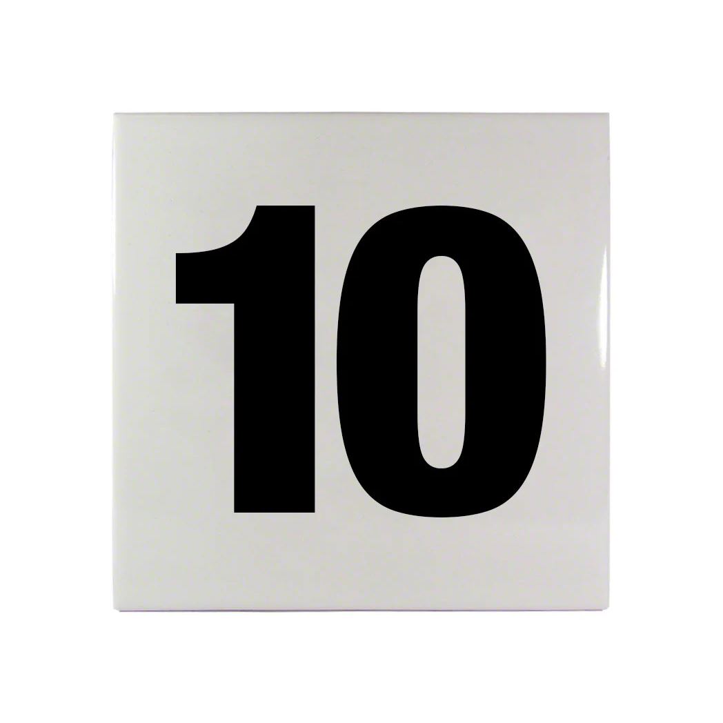 The Tile Specialties Inlays 6″ x 6″ 10 NO Series Smooth Ceramic Tile Waterline Depth Marker with Centered 4″ Black Lettering on White Tile, Frost Resistant. We offer the most extensive line of depth and safety markers available, including new construction and renovations products. Our tiles are printed with ceramic glaze inks, and then kiln-fired to ensure the most durable depth and safety marker line available!