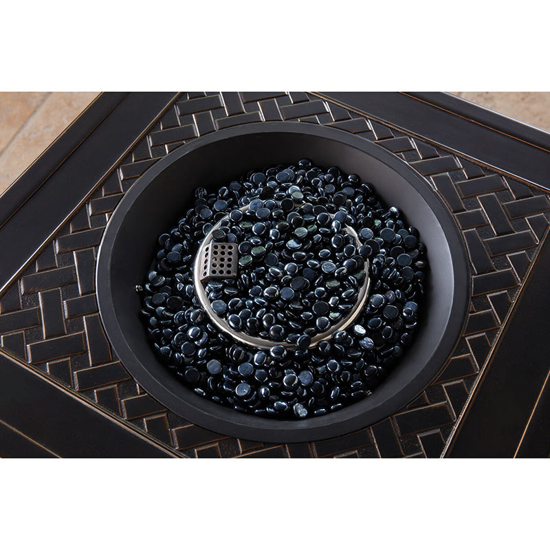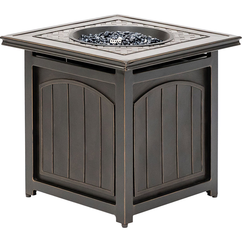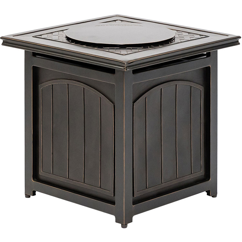 Add a warm and cozy fire to any outdoor seating arrangement with the Hanover Traditions 30,000 BTU fire pit side table. Hand-crafted with a golden-bronze finish, this fire pit easily blends in with other décor. A hidden tank chamber is conveniently located within the base of the unit, along with a control panel for customizable heat output. A 26-inch square alumnicast tabletop frames the round firebox. Black fire glass surrounds the round burner, beautifully reflecting the warm soothing flames, and a lid is included to cover the burner when it is not in use. Designed for year-round use, it is built to withstand the elements for your enjoyment year after year.
