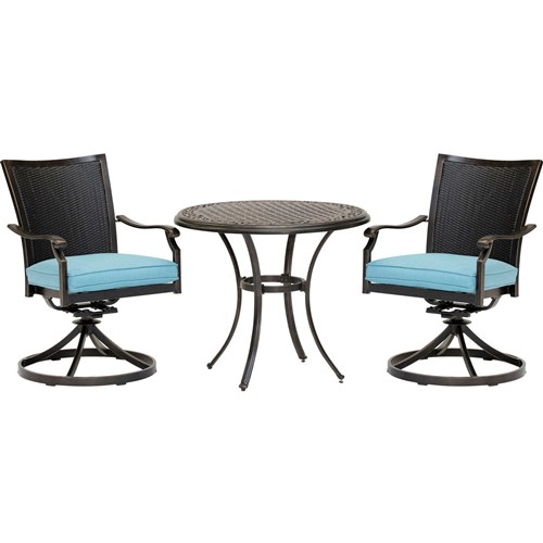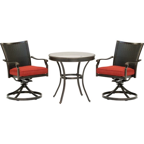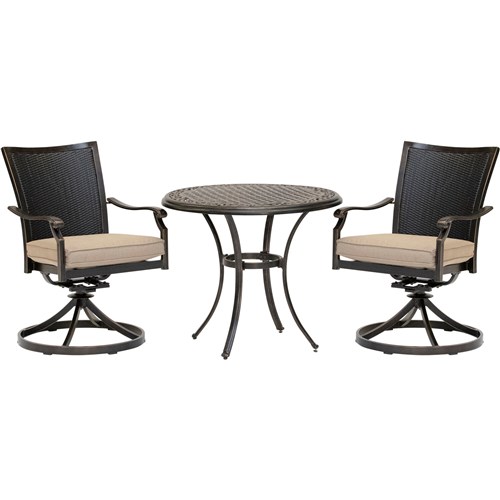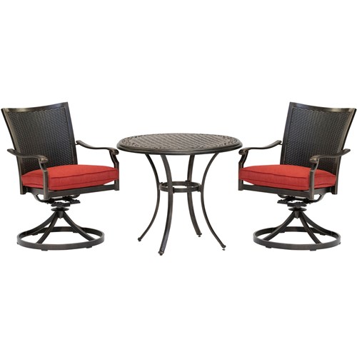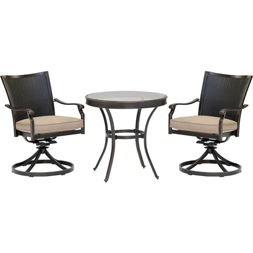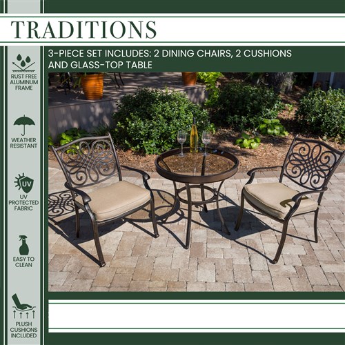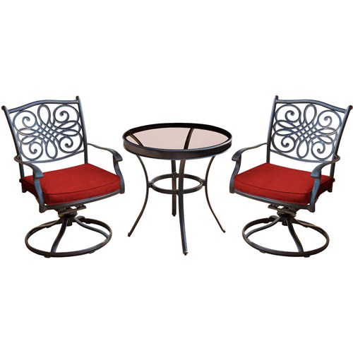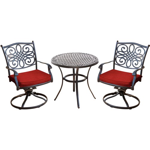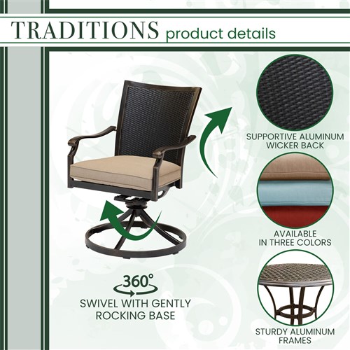 The Traditions 3-piece bistro set transforms any backyard into an intimate dining area for two. This set includes two cushioned swivel rockers and one 32 in. round cast-top bistro table. Both chairs and the table feature aluminum frames with a protective bronze finish. The swivel rocker chairs have decorative yet supportive aluminum wicker-textured backs and perform a smooth, 360-degree spin and gentle rocking motion. The plush seat cushions are constructed with premium outdoor fabric wrapped around polyurethane foam, ensuring deep comfort while maintaining their original full shape. The premium outdoor fabric is quick to dry while resisting accidental stains and UV harm. Perfect for smaller patios and environments where space may be limited, you can rely on this collection to provide the most stylish dining sets under the sun.