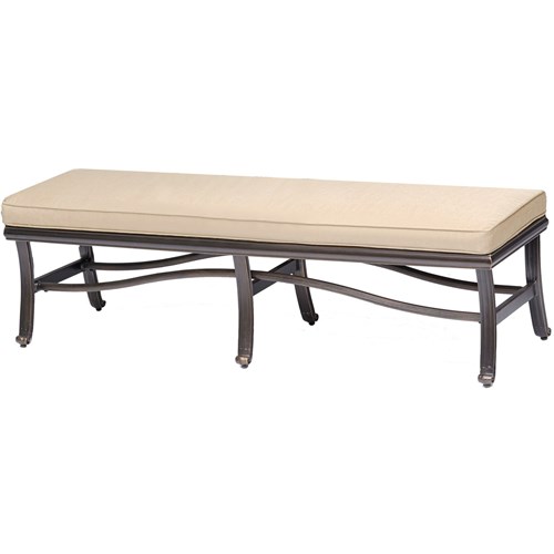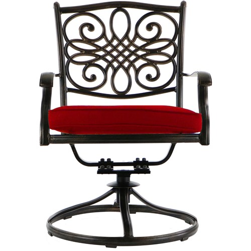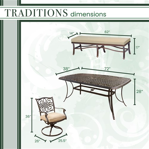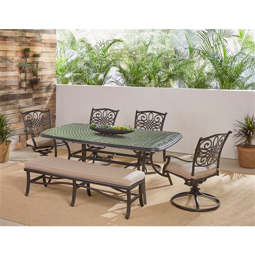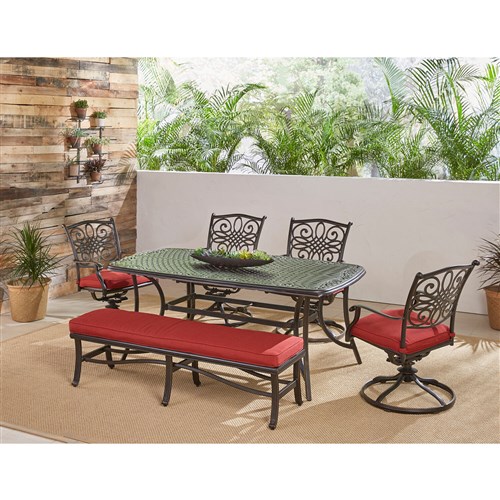 Create the perfect outdoor entertaining space on your patio, deck, or backyard with this 6-piece dining set from the Traditions Collection. Both elegant and inviting, this outdoor dining set includes four swivel rockers, a 3-person bench, and a 38” x 72” cast-top dining table. Your guests will love relaxing on the ultra-plush foam cushions that are included for each seat. Not only are these cushions soft and comfortable, they are thoughtfully designed with hook and loop fasteners that secure them to the frame so they stay in place. The coordinating bench can seat three adults comfortably and is perfect for last minute accommodations. The cast-aluminum table top features a vented, lattice design that won’t collect water and is virtually maintenance-free. As soon as you add a Traditions dining set to your patio or backyard, not only are you establishing the focal point of your outdoor living space, but you’ll be setting the stage for countless meals and memories with your family – right in the comfort of your own backyard.