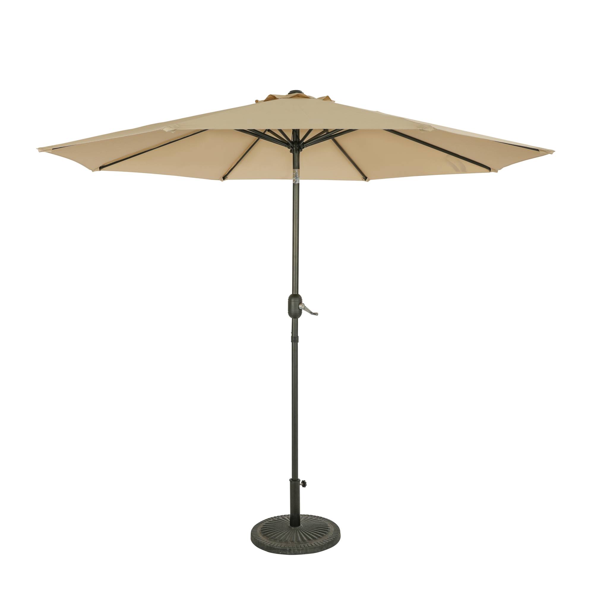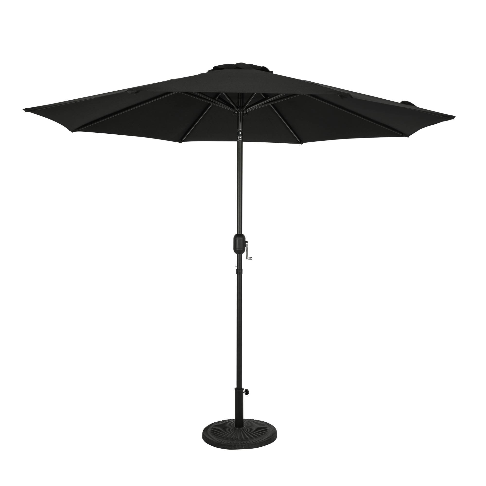 The Trinidad II 9-ft Octagon Market Umbrella is packed with quality features. The unique crank and open system with built-in-auto-tilt allows you to angle the umbrella against the elements and relax in the shade. The sturdy 1.5-in diameter powder-coated, rust-resistant steel pole and 8-rib canopy support system add the final touches to this quality umbrella. The canopy is covered in weather, mildew and fade-resistant polyester fabric, plus features a single wind vent that allows air to easily escape while limiting wind damage. The Trinidad II instantly provides up to 57 square feet of shade space during hot summer days. Polyester fabric canopy backed by 1 year warranty; 1 year warranty on pole and structure. Base sold separately.