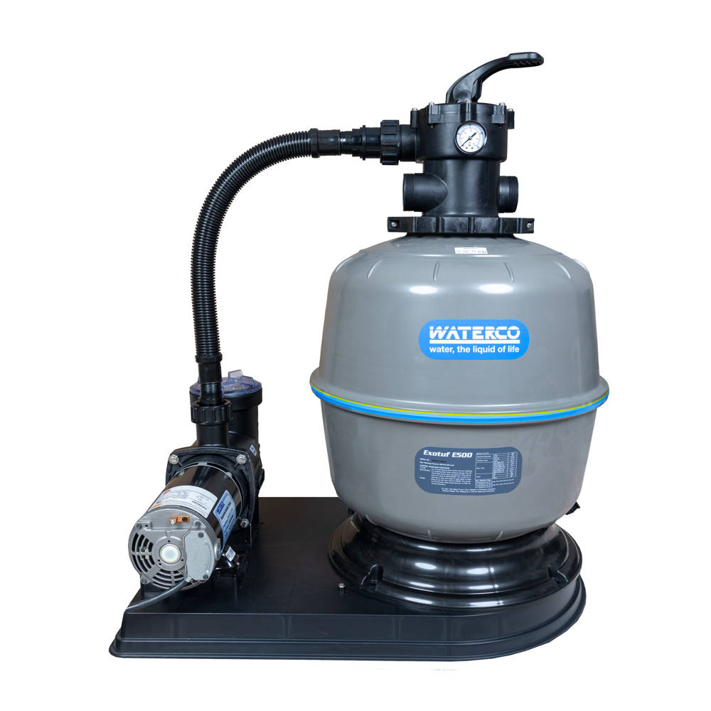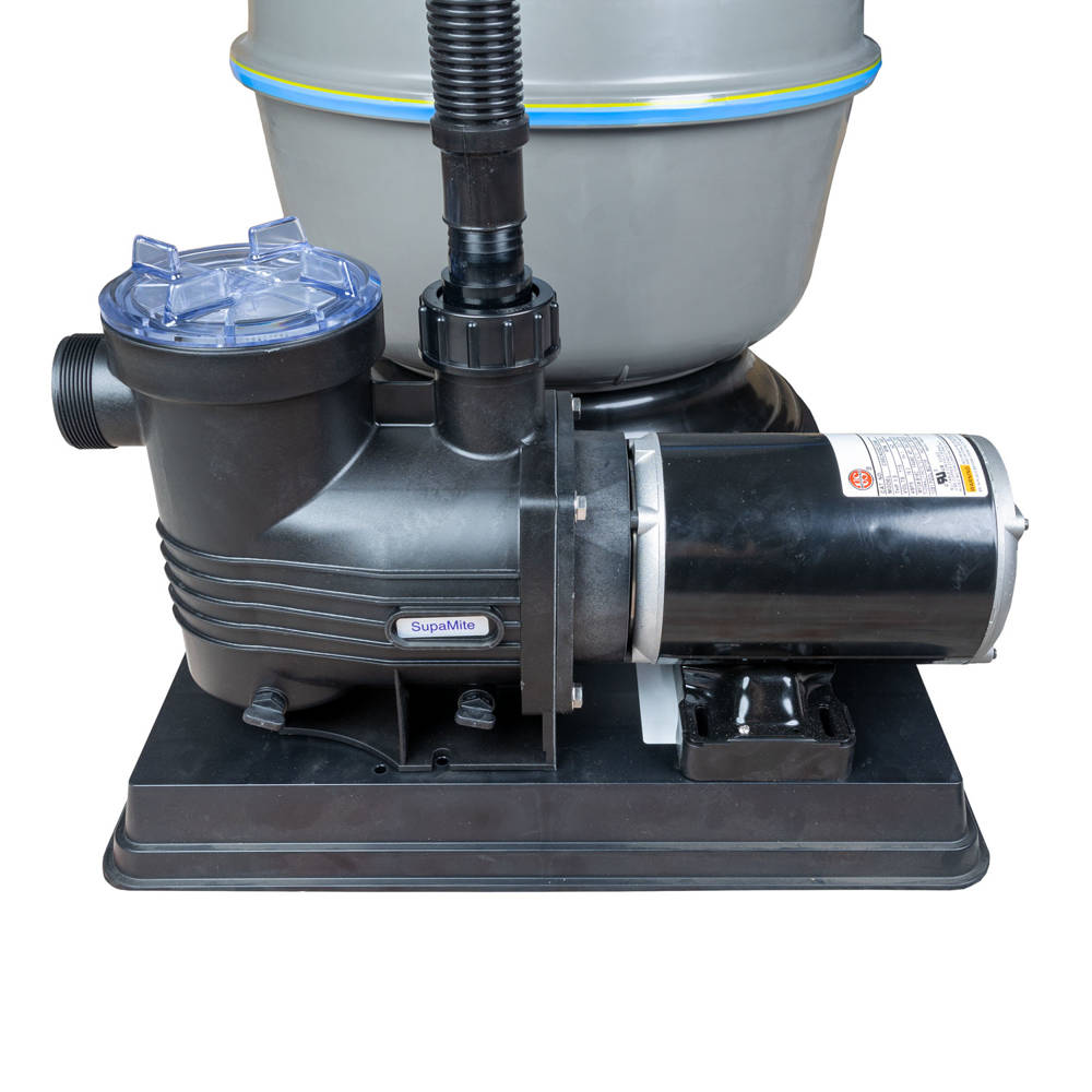 - System Includes: E500 Sand Filter, 1-1/2″ Multiport Valve, 1-1/2″ Hose, Skid base, 1.5 HP Supamite Pump