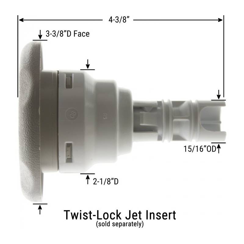 - Accepts Waterway 3-3/8″ & 4″ face, Poly Storm Twist-Lock non-threaded jet internal inserts.