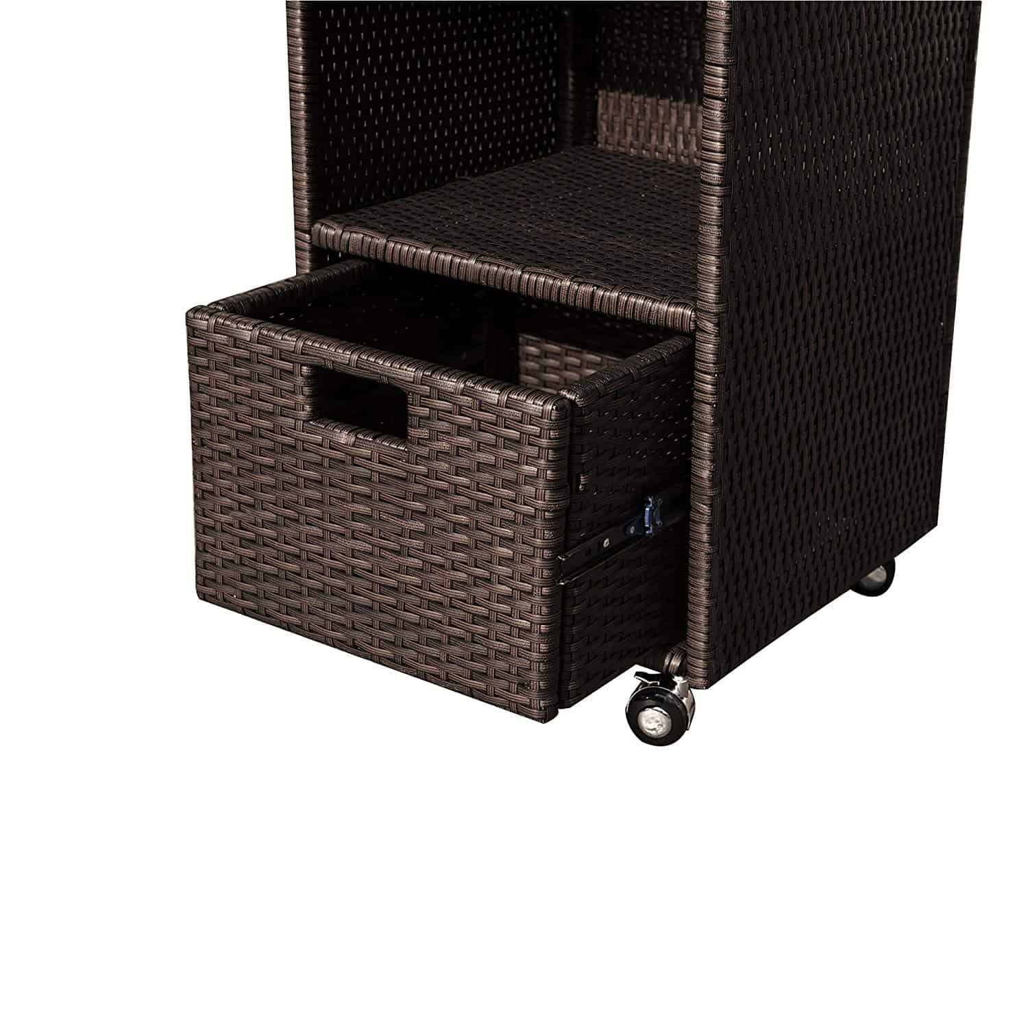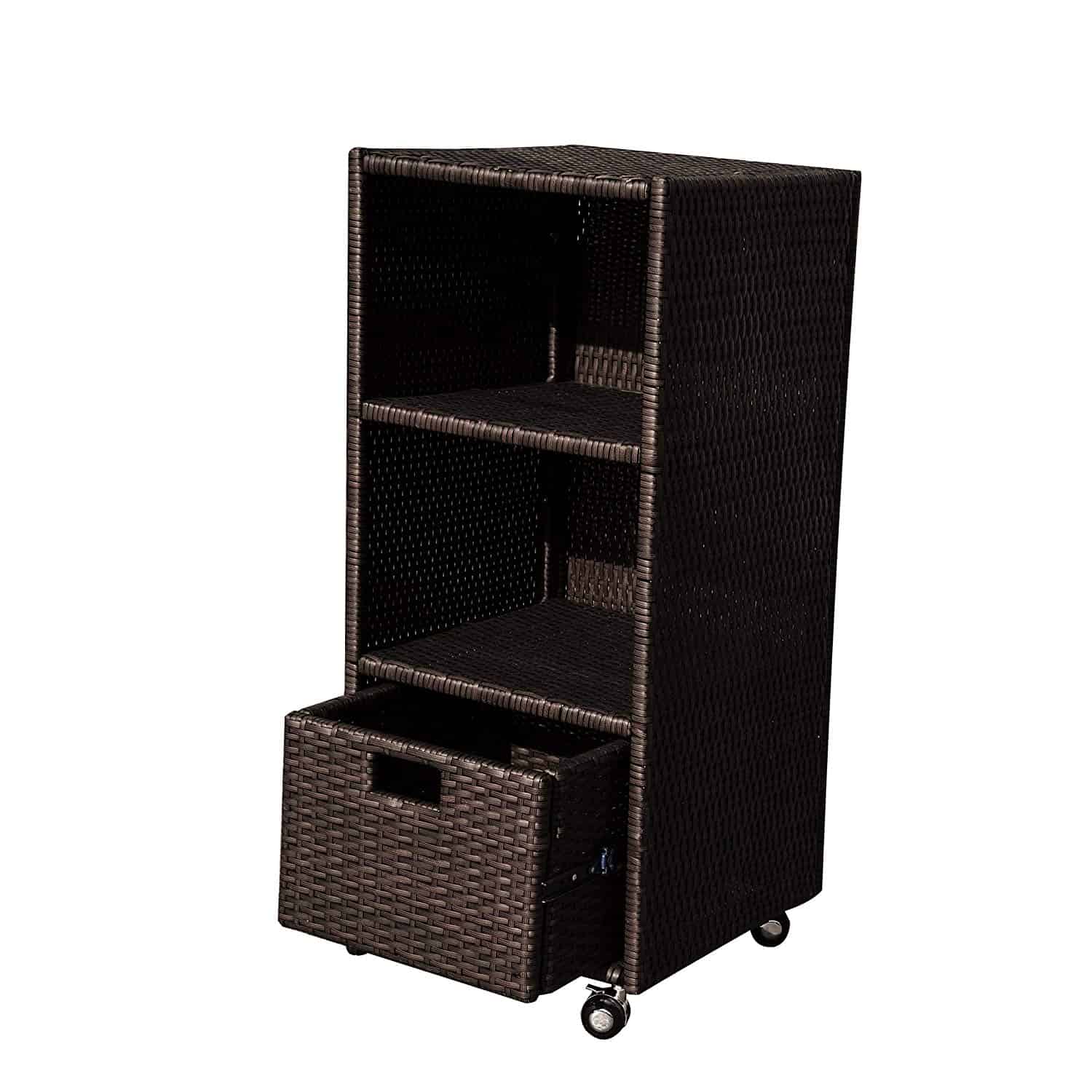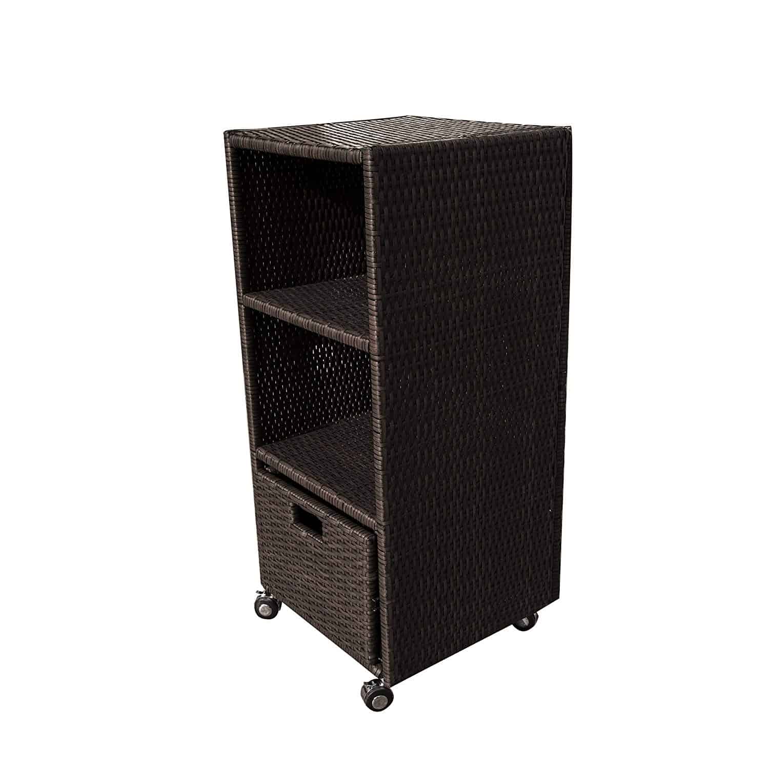 Keep your pool and spa area tidy with this Wheeled Wicker Tower Shelf. Made of weather-resistant wicker in a gorgeous weave pattern, this charming piece of patio furniture combines stylish looks with premium functionality. Store toys, cleaning supplies, and fluffy towels on one of its two shelves or in the pull-out drawer. This handy, rolling shelf also serves as a great hamper! Instead of lugging dirty laundry back to your house, just place on this durable shelf and keep the fun rolling. This pleasant patio piece is constructed with durable steel, weather-resistant wicker, and caster wheels. Includes 90-day limited warranty.
