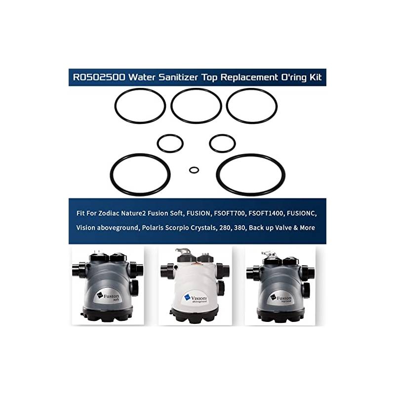 The Zodiac R0502500 is designed to use with Zodiac Nature2 soft water sanitizer models FSOFT700, FSOFT1400. Also fits Zodiac Nature2 Fusion inground water sanitizer model FUSION. This kit large collar O-ring, small collar O-ring, unions and port plug O-ring, feeder shaft O-ring and drain plug O-ring.